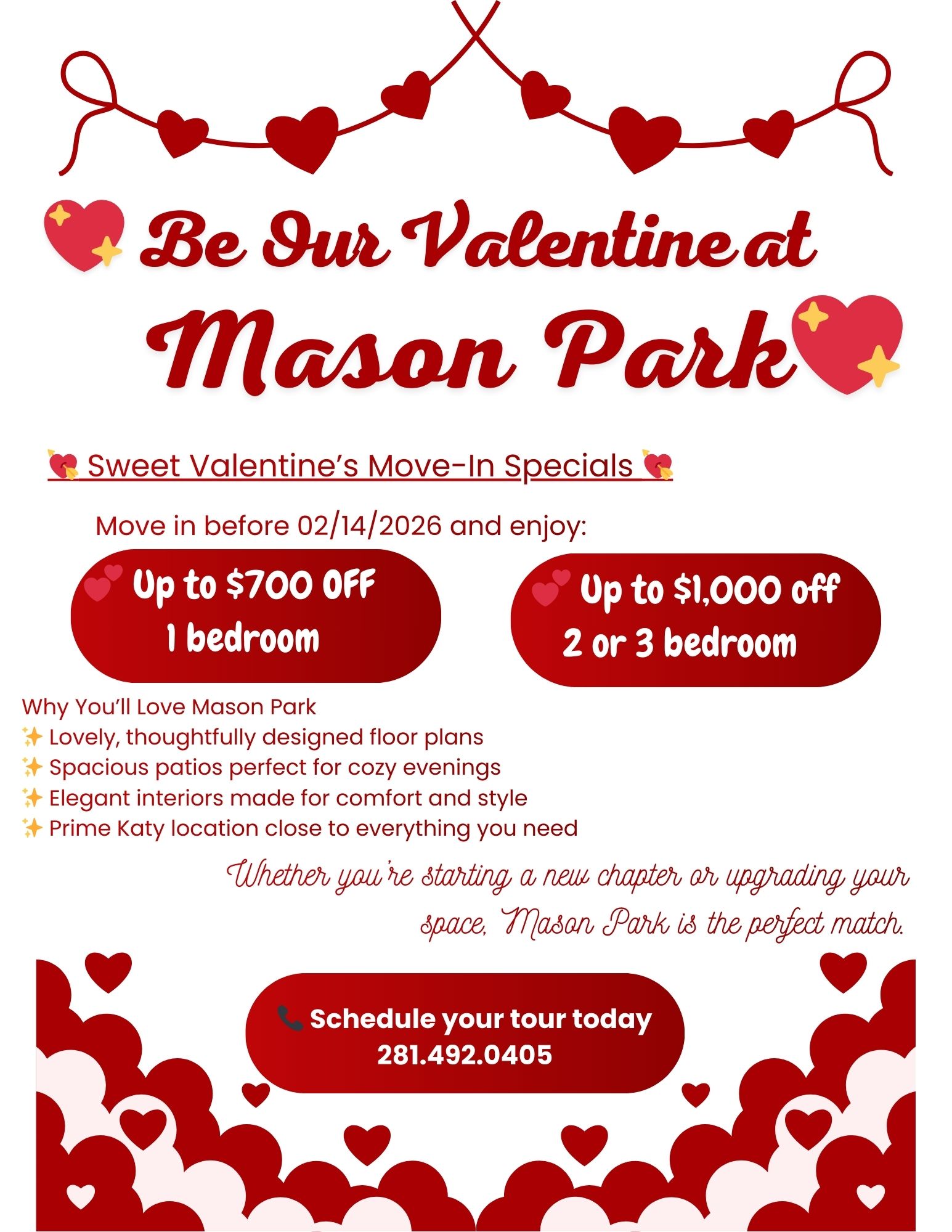 Fall in Love With Where You Live This Valentine’s season, find the home that steals your heart at Mason Park Apartments. 📍 222 Mason Creek Dr, Katy, TX 77450 💘 Sweet Valentine’s Move-In Specials 💘 Move in before 02/14/2026 and enjoy: 💕 Up to $700 OFF one-bedroom apartments 💕 Up to $1,000 OFF two- and three-bedroom apartments (Limited-time Valentine’s special. Terms apply.)